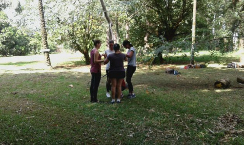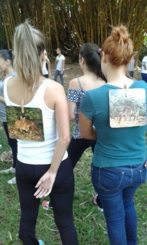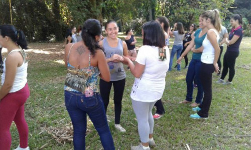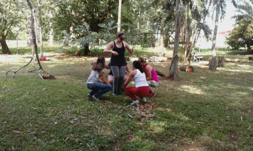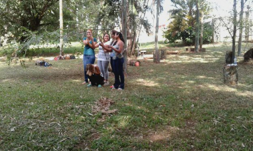 Alunas do 2º ano do curso de Pedagogia durante aula prática sobre vivências na natureza realizada, realizada no dia 18 de março, na Chácara Furquim, em Bebedouro-SP.