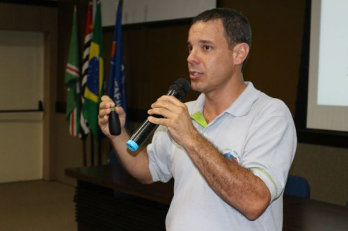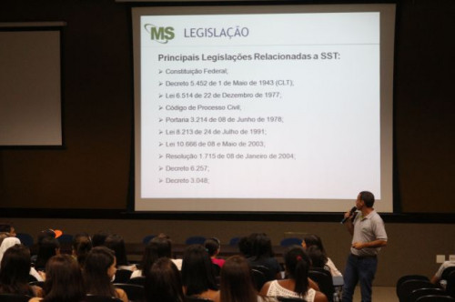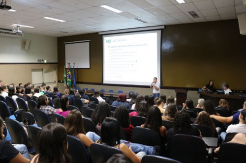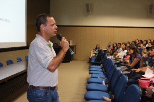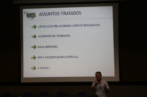 Palestra sobre risco biológico e suas complicações, ministrada aos alunos do curso de Enfermagem pelo técnico em segurança do trabalho e aluno do curso de Engenharia Civil, Everton Luiz Grecco dos Santos.