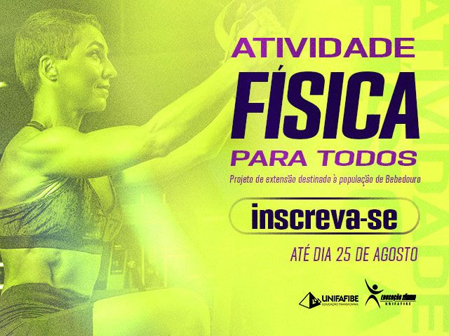 Estão abertas as inscrições para o Projeto "Atividade Física para Todos" do Curso de Educação Física. O projeto "Atividade Física para Todos" é uma iniciativa do curso de Educação Física do UNIFAFIBE, que visa oportunizar a prática de exercícios físicos para diferentes públicos, promovendo a saúde e o bem-estar dos participantes. Além disso, o projeto, oferecido gratuitamente, é um campo de estágio para os profissionais em formação.