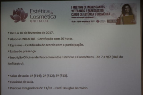 Abertura do I Meeting de Ingressantes, Veteranos e Egressos do Curso de Estética e Cosmética que aconteceu no dia 06 de fevereiro, durante a Semana de Integração e Acolhimento dos alunos.