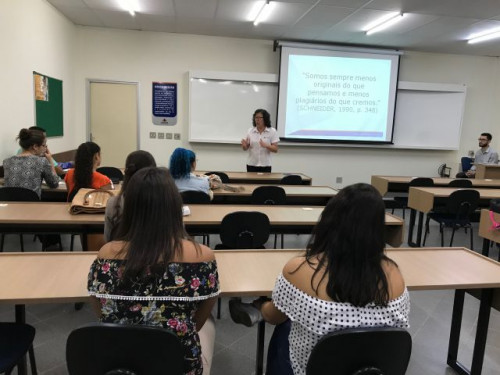 Curso de Extensão "Estrutura e desenvolvimento da pesquisa científica" ministrado pela Bibliotecária Marisa Aparecida Graziadei de Carvalho para os alunos com projetos de Iniciação Científica.