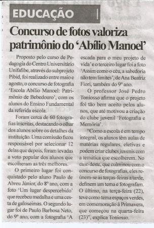 O concurso de fotografias realizado na E.E. Abílio Manoel pelos bolsistas do Pibid foi divulgado no Jornal Gazeta de Bebedouro, no dia 26 de setembro, com o intuito de divulgar e valorizar as ações que tem sido propostas pelo Pibid. Parabéns aos bolsistas pelo sucesso dessa atividade em especial e pelo ótimo desempenho em todas as outras!
